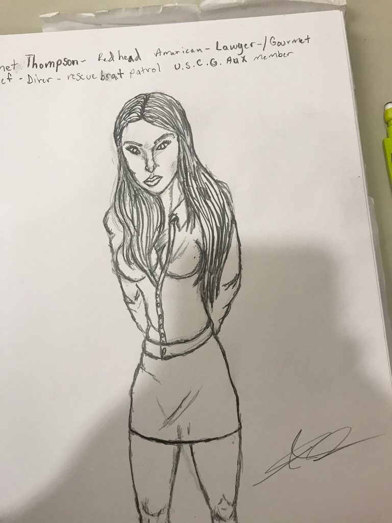 Janice Thompson……………………… Legal Rep. / Lawyer / Gourmet Chef, American Female short red hair, 5’6″ 120lbs., rescue boat coxswain U.S.C.G.A. Lieutenant.. single spitfire personality.